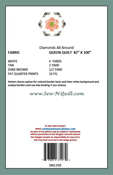 This is a very fun Hexi quilt that is made using my hexi quilt stamps or hexi quilt templates. This can be made with the English Paper Piecing but I designed the stamps and the templates so that everything can be sewn on the sewing machine which is my method of choice. I have many tutorials on my youtube channel explaining the method and showing how to sew the blocks. In youtube search my company Sew-N-Quilt. The fabric displayed in this is from a line by Sherri and Chelsi called “Balboa” and manufactured by Moda. For more information and tutorials see videos and information on my website and youtube. This is an intermediate to advanced quilt pattern.