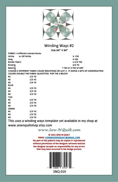 This is a non traditional way to use the winding ways templates to create this quilt design. The winding ways templates create a curve but it is a gentler curve than drunkards path. This is an intermediate to advanced quilt pattern. For Yardage and other information check out my other images.