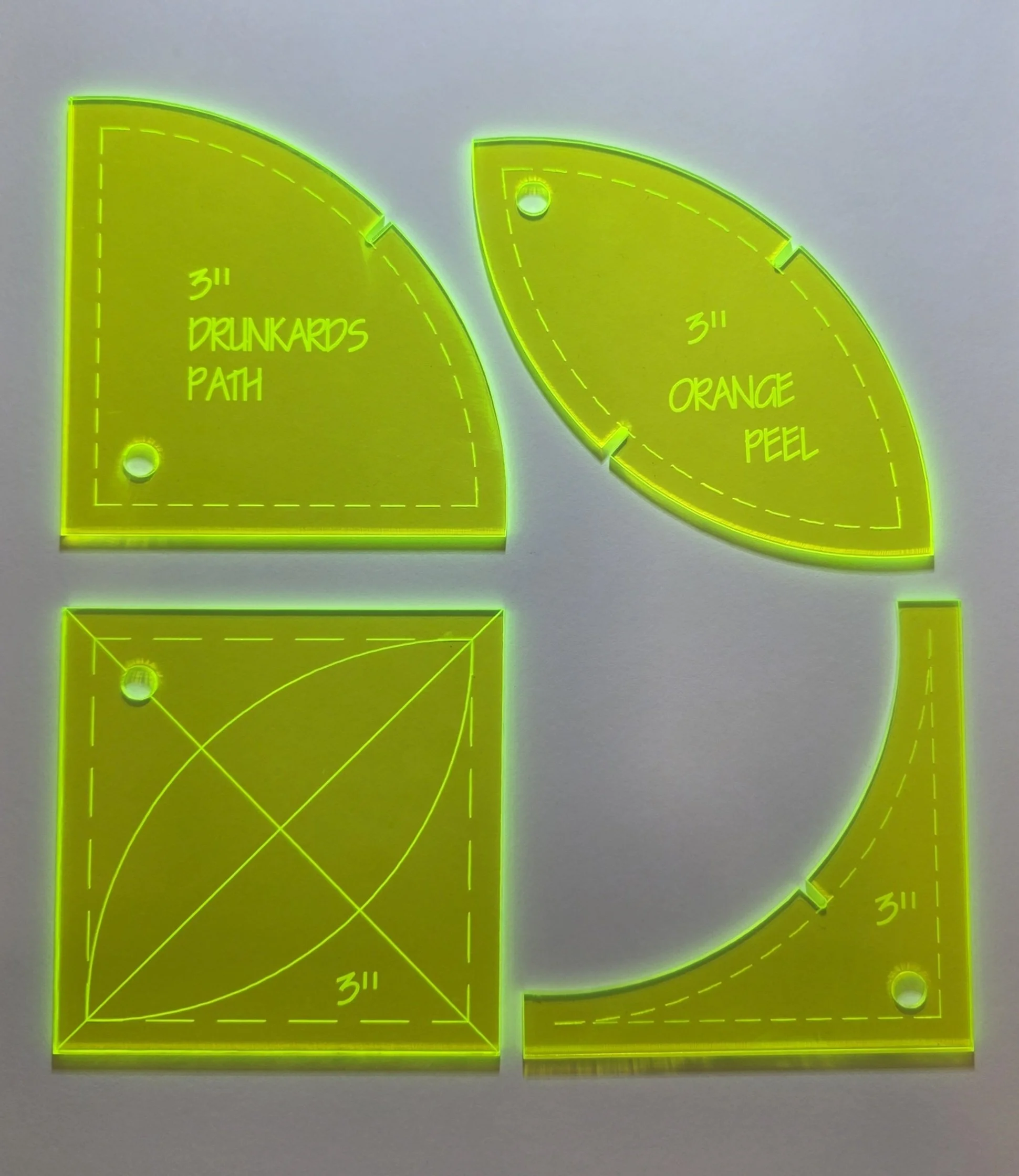 This template set comes with 4 pieces that are made out of 1/8” thick transparent yellow acrylic. There is the traditional drunkards path inner curve piece and the outer curve piece. Other pieces have been added to create even more quilts. There is an orange peel piece and a squaring template. The squaring template is part of my system to get perfect blocks.